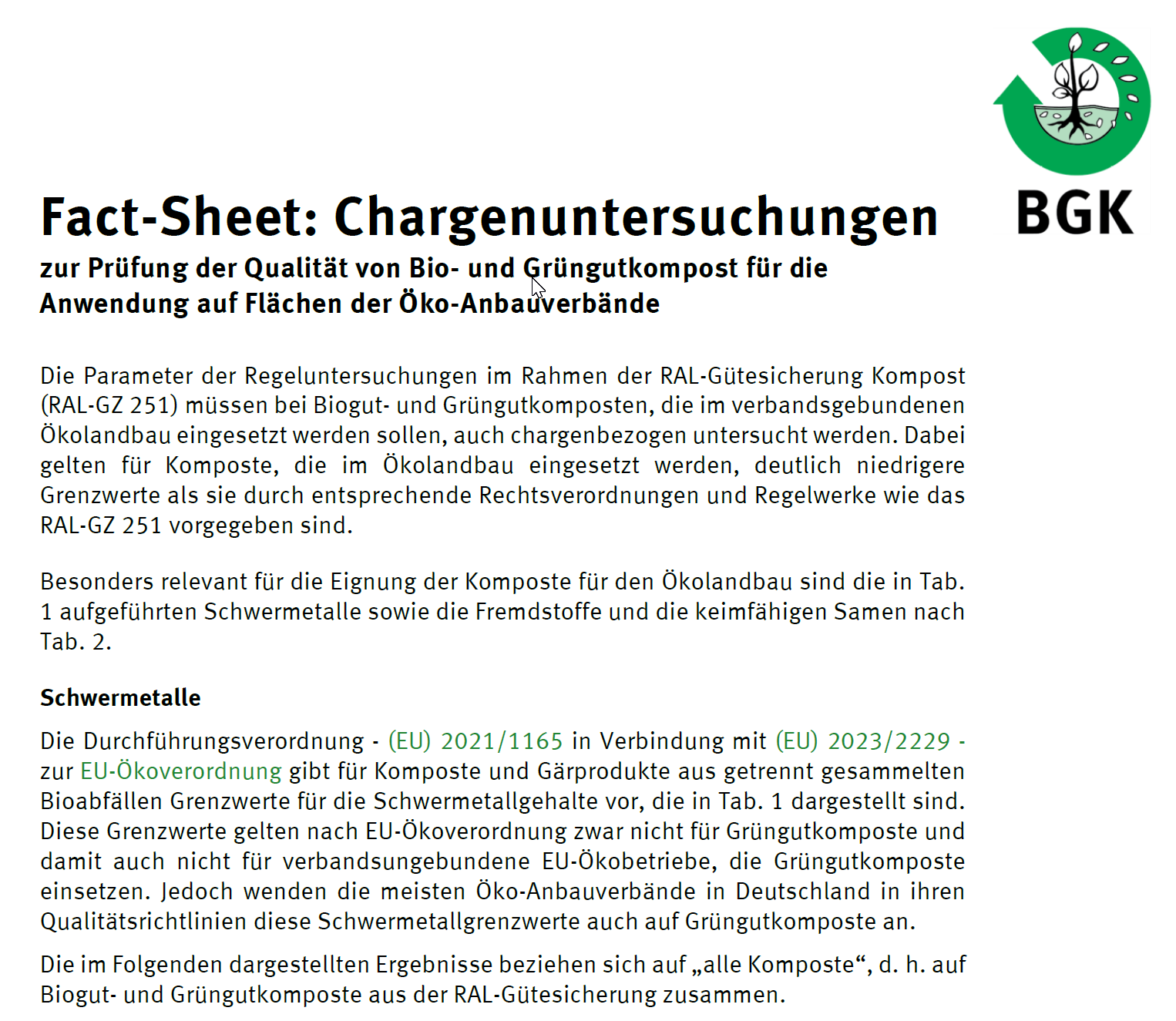 Chargenuntersuchungen sind die Analysen, die bei jeder in den Ökolandbau vermarkteten Kompostcharge durchgeführt werden. Besonders wichtig für den Ökolandbau sind die hierbei erfassten Fremdstoff- und Schwermetallgehalte, die im Factsheet für das Jahr 2023 aufgeführt sind.