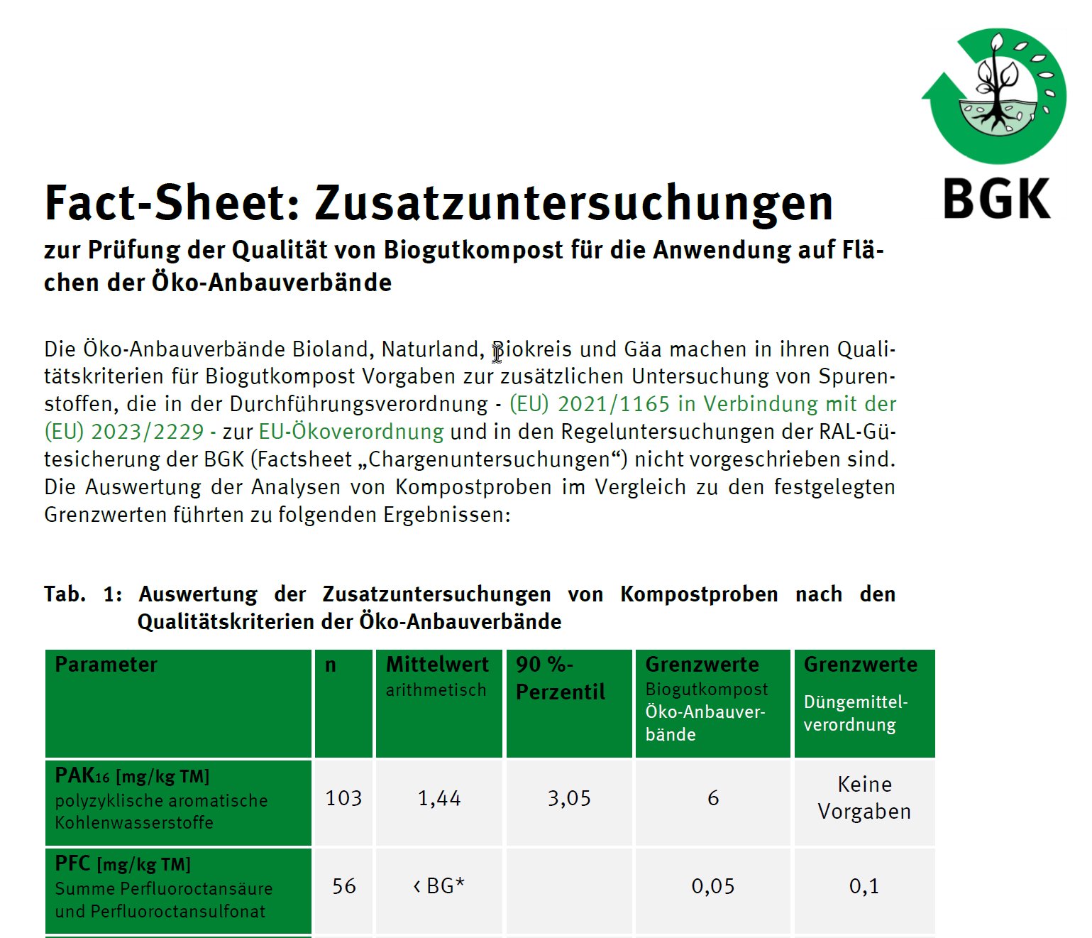 In bestimmten zeitlichen Intervallen werden „Zusatzuntersuchungen“ für den Ökolandbau durchgeführt, die sämtliche seitens der Öko-Anbauverbände geforderten und mit den regulären Analysen im Rahmen des RAL-Gütezeichens 251 Kompost der BGK nicht abgedeckten Parameter umfassen. Dies betrifft v. a. organische Schadstoffe und weitere Schwermetalle.