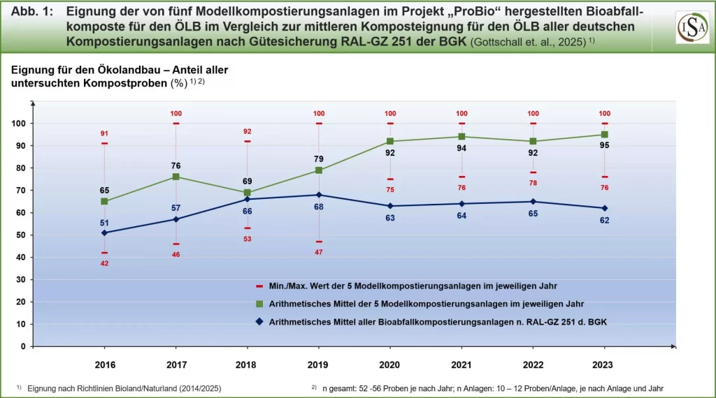 Neben Qualitäts- und Potentialanalysen sowie Vorschlägen zu einer Gütesicherung für flüssige Gärprodukte im Ökolandbau ist dabei im Kompostbereich die Auswertung der Daten aus den fünf Praxisanlagen zur Bioabfallkompostierung von besonderem Interesse, die als „Modelle“ Teil des Projektes ProBio waren. Diesbezüglich wurde unter anderem deutlich, dass es durchaus möglich ist, mit einem Bündel von Optimierungsmaßnahmen die bereits zuvor schon guten Kompostqualitäten solcher Anlagen weiter zu verbessern und so auch die Eignung der Komposte für den Ökolandbau aus der entsprechenden Anlage noch erheblich zu steigern (Abb. 1).